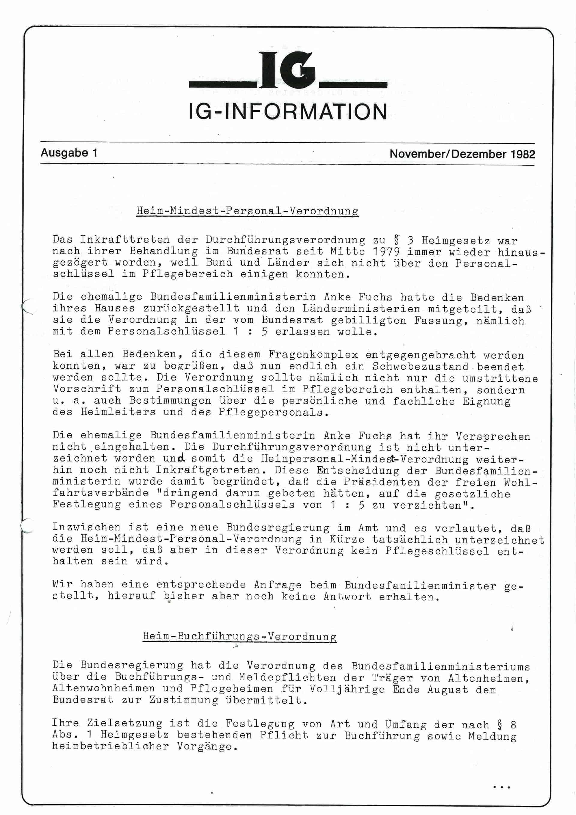 Ebenfalls im Jahr 1982 erschien zum ersten Mal die BIVA-Informationsschrift, die unter dem Namen „IG–Information“ 6-mal jährlich erschien. In diesem Nachrichten-Magazin werden Mitglieder und Interessierte über wichtige Neuerungen in der Altenhilfe informiert. Darin werden aktuelle Themen rund um die Themen Pflege und Leben in einer Einrichtung verständlich aufbereitet. Heute trägt das Magazin den Namen „BIVA-Informationen“, wird als Newsletter verschickt und erscheint alle zwei Wochen.
